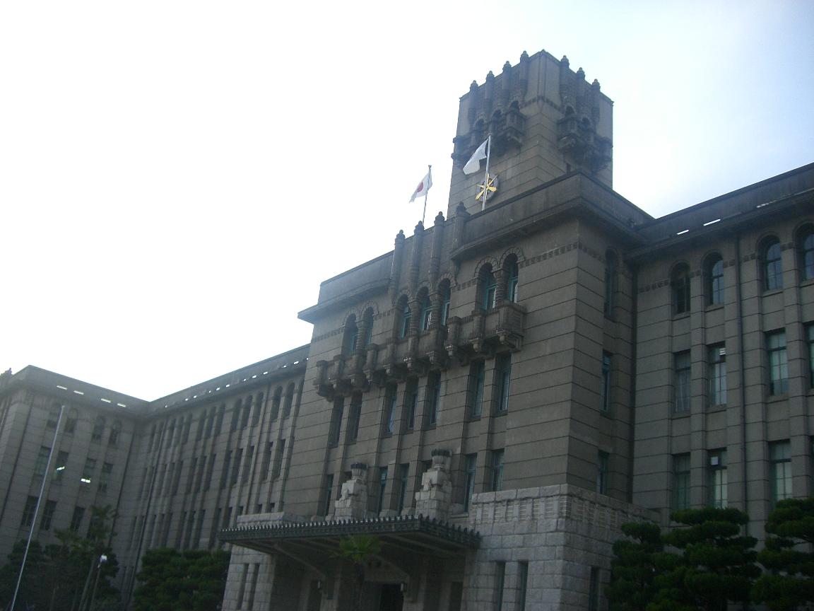 京都市役所の改札を出たら、とにかく一番さいしょに目に付いた出口から地上へ。出てきたすぐそこに、京都市役所の建物が見えます。
